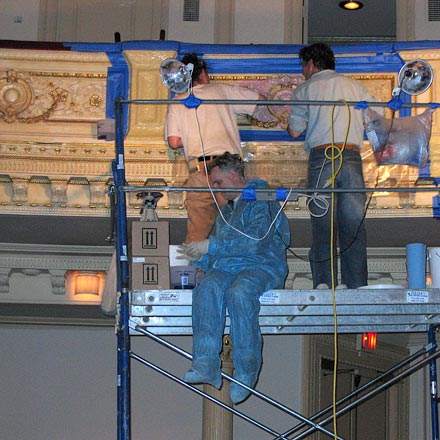 Ernest Neuman Studios are experts at conserving existing ornamental plaster. The first step in determining the existing conditions is to examine the black iron framing and lath. We then sound the existing plaster to determine its current condition from which we develop a site specific treatment to assure a safe and aesthetically complete restoration.